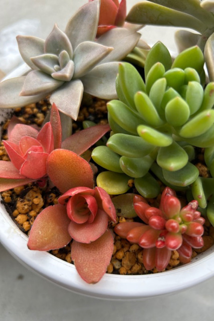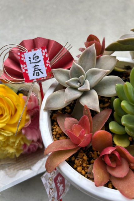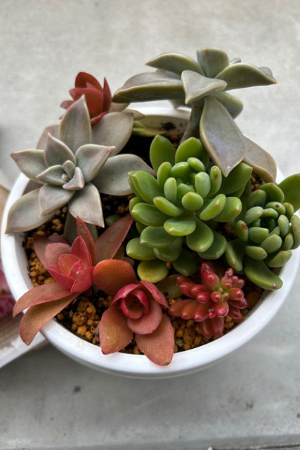 去年、小さな缶に入った多肉植物が残念ながら枯れてしまったお話をしたら、たくさん育てておられる株の中から寄せ植えにしてくださいました。植物の姿も植え方もとってもすばらしいです!お店にそのまま並んでいそうな美しさで感激。ありがとうございます!