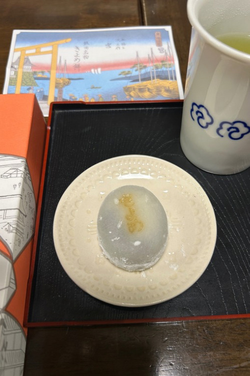 ススキと秋の花の素敵なアレンジメントを飾ってみました。真ん中の菊が満月みたいでかわいい。月見団子は代わりに丸いお餅にしてみました。夜は涼しくなってきたので温かいお茶と一緒に。お愛知県の名物のひとつ「きよめ餅」です。熱田神宮の周辺で売っていますね。中につぶあんが入ってもっちもちです。