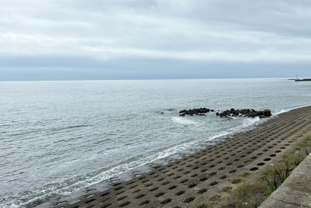 この日は雨は降っていないものの、かなり暗めの曇り空でした。雲の隙間からうっすら光がさしてきます。海は波が高めで、暗い色をしていました。