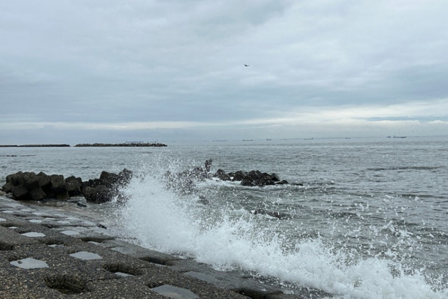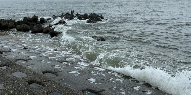 遠くは平坦に見えますが、波打ち際はけっこう荒々しい景色です。飛び散る波しぶき。防波堤の上まで波が上がってきていました。青い海ではないのですが、目まぐるしく変わる波の様子が面白くてずっと見てしまう光景です。
