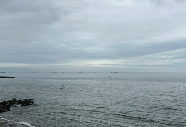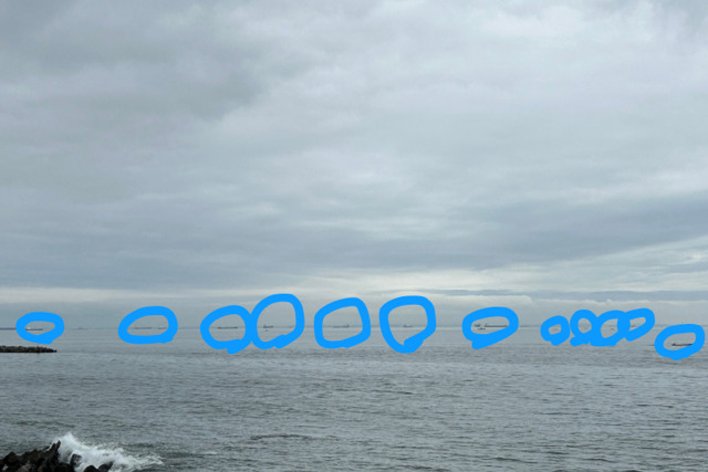 海と空の境が分かりづらい単調な景色にみえますが、よく見るとたくさんの船が遠くに見えます!10隻以上いるみたいです。