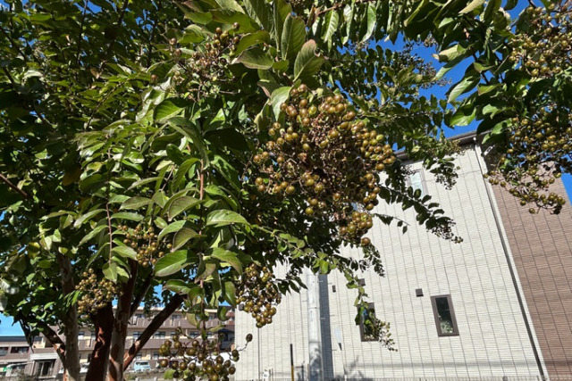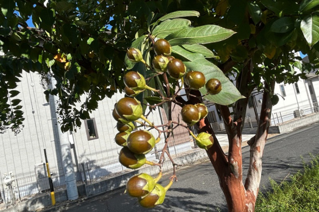 この鈴なりになっている実は何でしょう?「サルスベリ(百日紅)」だそうです。これは調べる前にわかりましたよ。木の幹がツルツルしているからです。こちらもお花が綺麗な木ですね。こんな実がなるとは知りませんでした。木の実で秋を感じた1日でした。