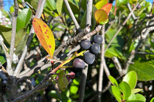 黒っぽいブルーベリーのようなこの実は何でしょう。調べたら「シャリンバイ(車輪梅)」という樹木の実だそうです。