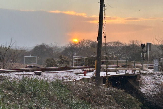 やがて鉄橋越しに朝日が昇ってきました。空気が凍るように冷たいけれど、とても暖かそうなオレンジの日の出。いつもの景色が少しの雪で特別になります。