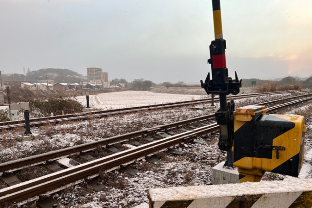 急いで事務所の近くの亀山橋に行ってみました。歩道は足跡が全くなく、雪で真っ白。橋の近くからJR線が見えます。雪景色の田んぼと踏切もとてもきれいでした。