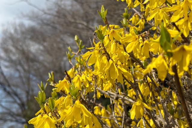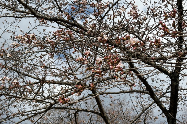 レンギョウとかユキヤナギも綺麗な中、ちょっとだけ咲いていましたよ。まだ一分咲き。咲いていない木もどことなくピンク色っぽいです。